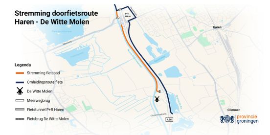 Het fietspad langs de A28 en het Noord-Willemskanaal tussen de Witte Molen en Haren, onderdeel van de Doorfietsroute Assen - Groningen, is vanaf maandag 30 juni tot en met vrijdag 25 juli en van 18 augustus tot en met 8 september afgesloten. Het deel tussen de Meerwegbrug en de fietstunnel bij P+R Haren is tot en met 25 augustus dicht. Kijk voor meer informatie op de website van de provincie Groningen.